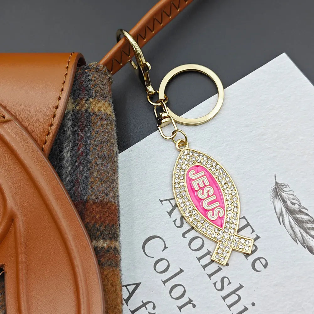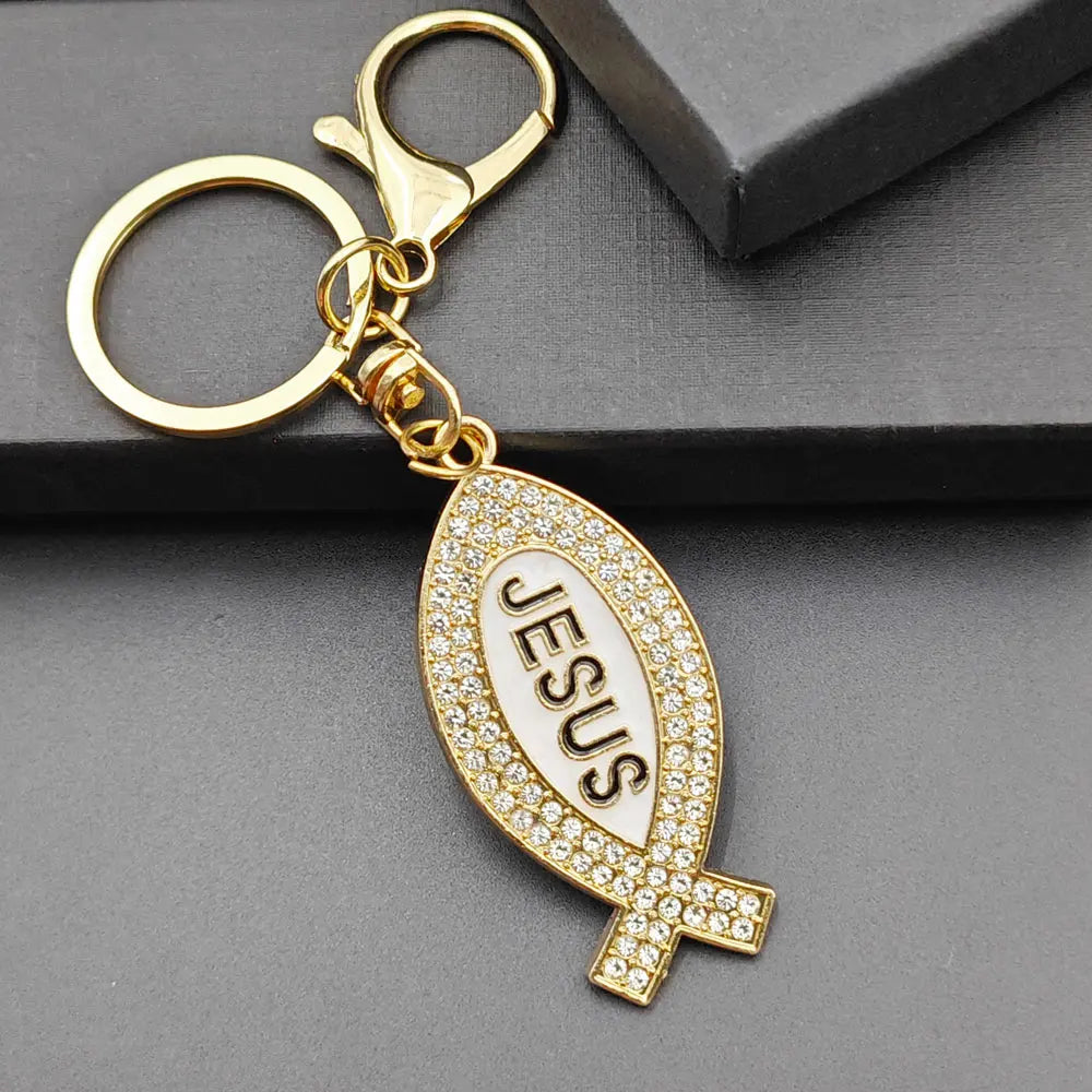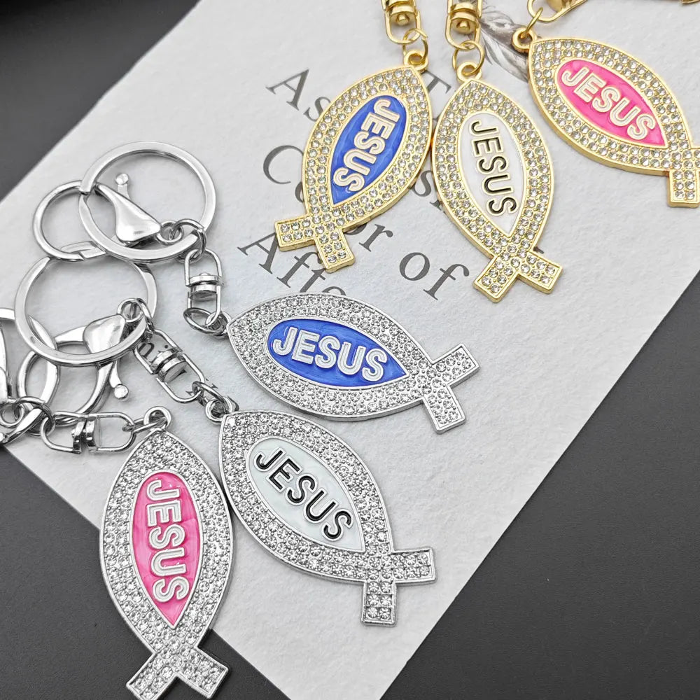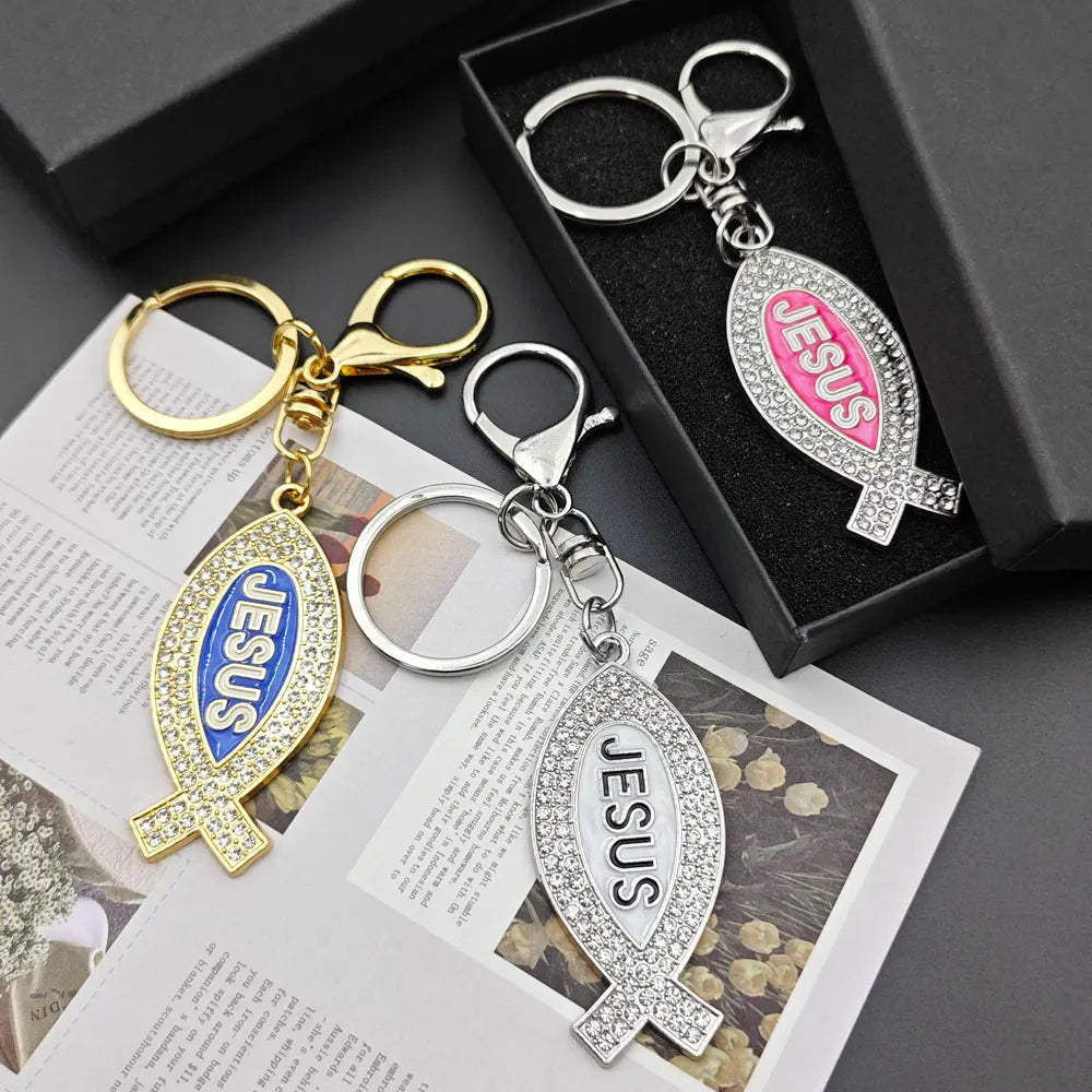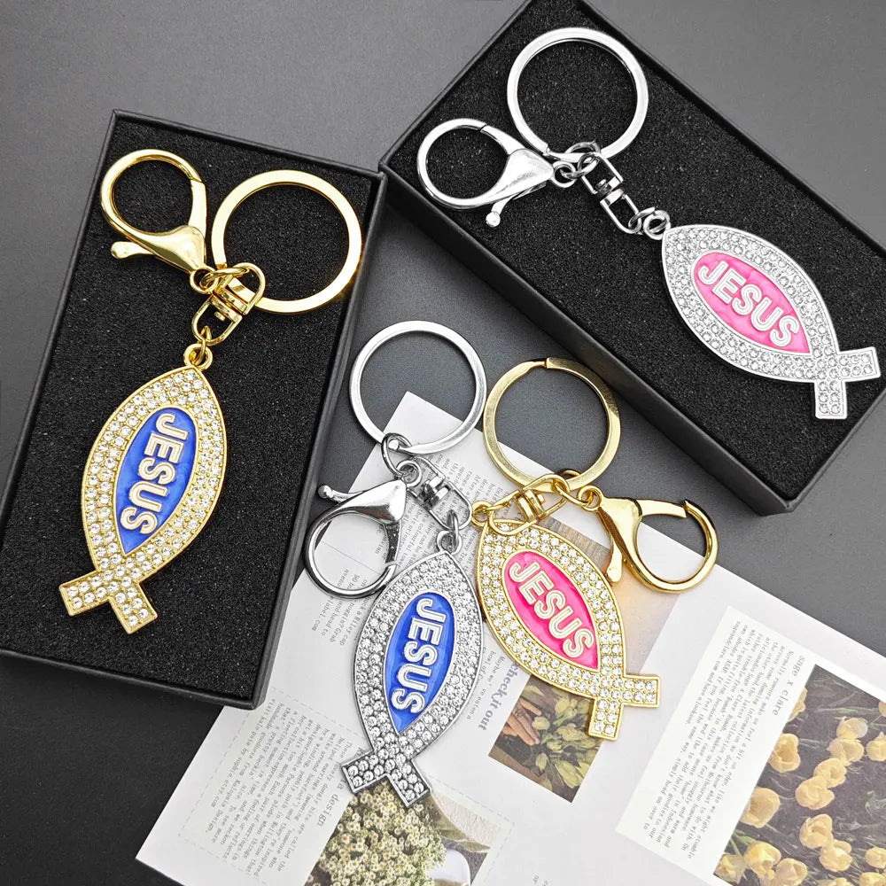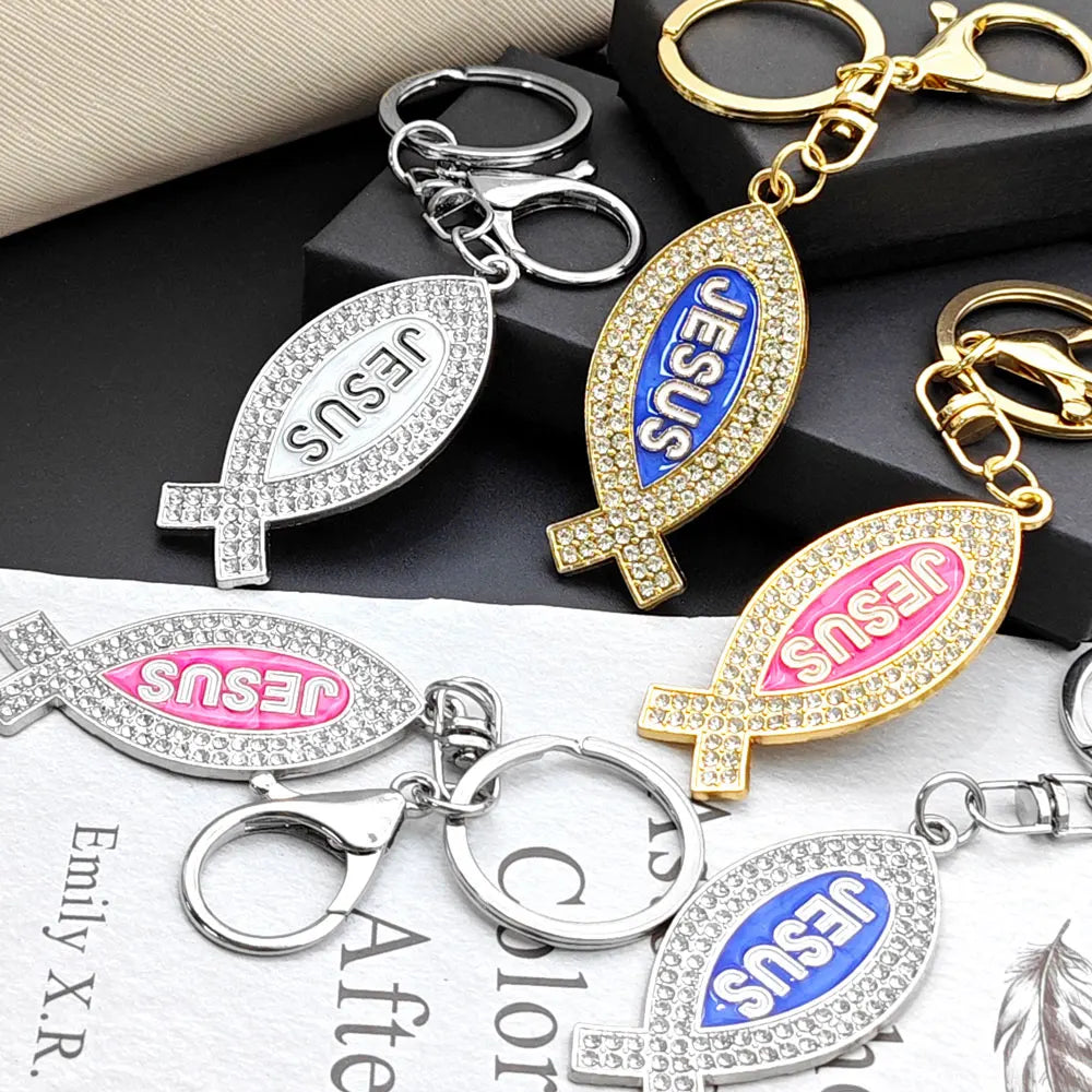 Cartoon Metal Fish Shaped Keychain Originality I Love Jesus Letter Keyring Shining Car Creative Key Chain Ring Souvenir Gift